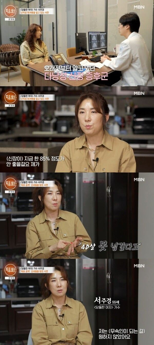 29일 방송된 MBN ‘특종세상’에 출연한 서주경은 30년째 다낭성 신장 증후군을 앓고 있다고 고백하며 안타까움을 자아냈다. 그는 “제가 3기다. 4기로 넘어가는 건 알 수가 없다. 지금 신장이 85%가 안 좋을 거다”라고 담담하게 현재 상태를 전했다. 유전으로 인해 어머니에게 물려받은 이 희귀병은 심할 경우 신장 투석까지 받을 수 있다는 진단을 받았다고 한다.
