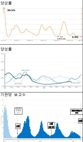 2023년과 2024년 여름 및 겨울철 유행 이후 2025년에는 지속적인 감소세를 보이고 있다.