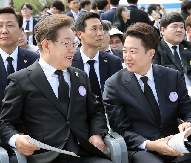 이재명 더불어민주당 대통령 후보가 18일 광주 5·18민주묘지에서 열린 제45주년 5·18민주화운동 기념식장에서 이준석 개혁신당 후보와 이야기를 나누고 있다. / 뉴스1