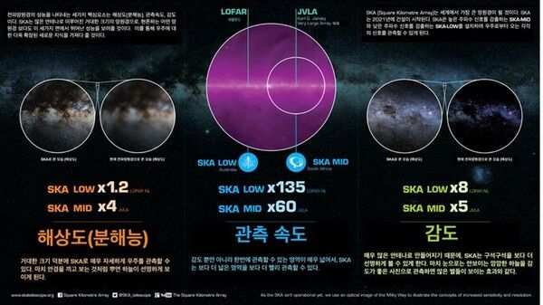 SKA는 기존 전파망원경보다 해상도, 관측 속도, 감도 등에서 우수한 성능을 지녔다. 우주 초기의 희미한 전파 신호까지 관측 가능하다.
