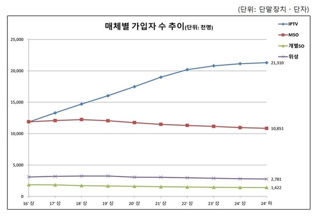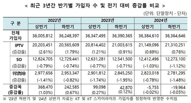 IPTV 가입자 수는 전반기 2114만명에서 하반기 2131만명으로 0.76% 늘며 점유율도 58.6%로 상승했다. 반면, SO와 위성방송은 각각 1.12%, 1.48% 감소하며 점유율은 각각 33.75%, 7.65%로 줄었다.