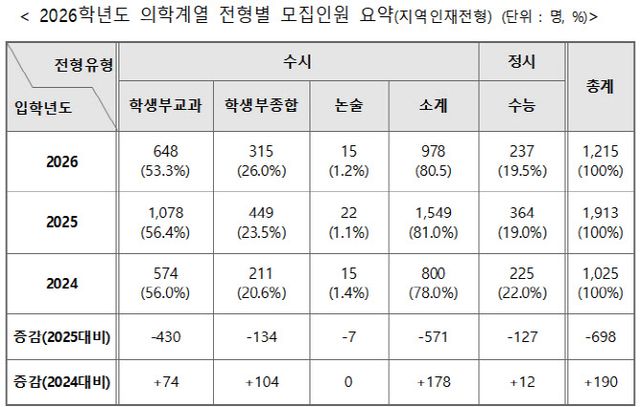2026학년도 지역인재전형 모집 인원은 총 1215명으로, 전년도(1913명)보다 698명 줄었지만, 증원 이전인 2024학년도(1025명)와 비교하면 190명 증가한 수치다.