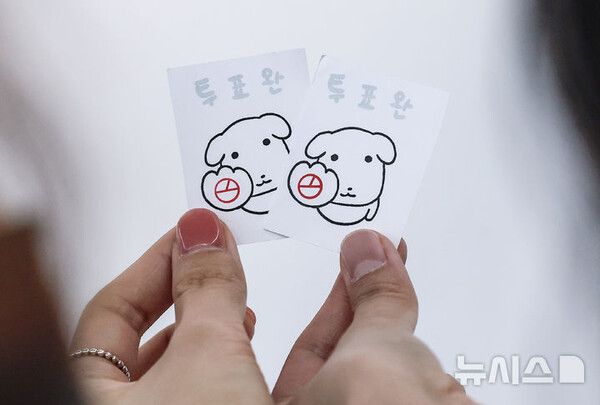 [서울=뉴시스] 제21대 대통령 선거 사전투표 마지막 날인 30일 인천국제공항 제1터미널 출국장에 설치된 사전투표소를 찾은 유권자들이 투표를 마친 뒤 인증사진을 찍고 있다.