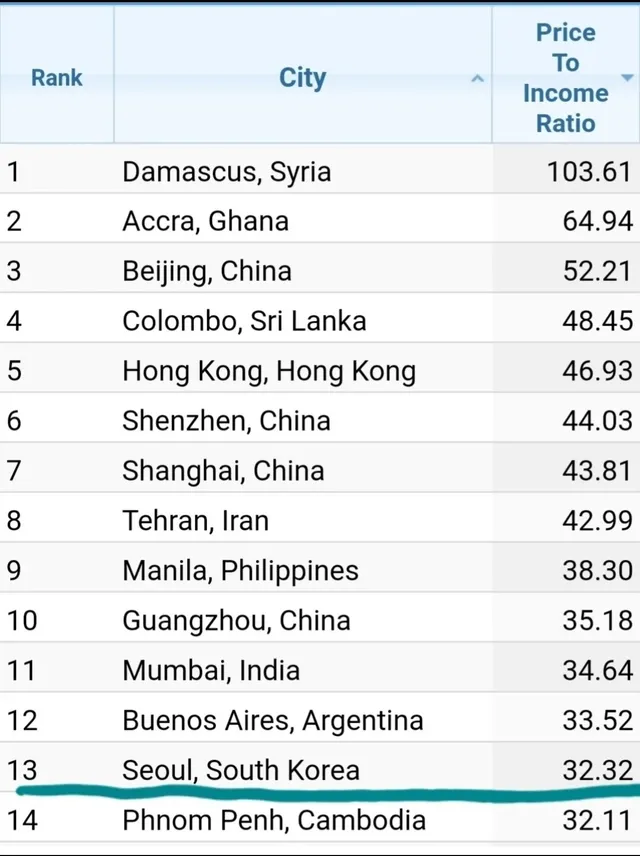 한국 서울의 PIR 지수는 32.32 로 여타 선진국의 2~3배가 된다.