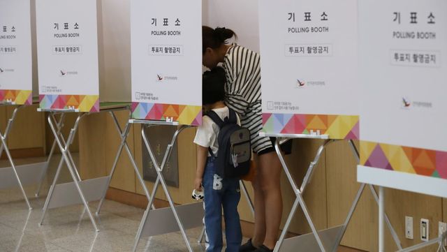 제21대 대통령선거 사전투표 둘째 날인 30일 오전 부산 남구청 대강당에 마련된 사전투표소에서 유권자가 아이와 함께 투표하고 있다. / 뉴스1