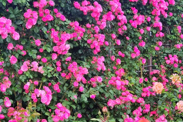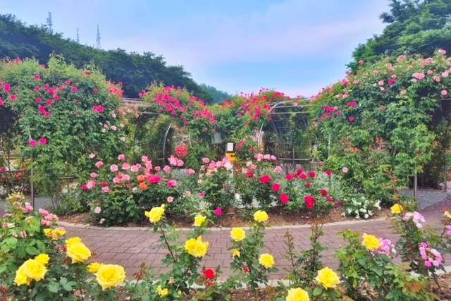 장미공원은 규모가 큰 동쪽 입구와 서쪽 입구로 나뉩니다. 동쪽에서 주차가 용이하고, 서쪽에는 다양한 판매 부스와 특산물 매장이 자리잡고 있습니다. 장미 정원을 거닐며 철교 위를 지나는 기차 풍경도 감상할 수 있으며, 동쪽 입구에서 서쪽 입구까지 약 1.5km의 산책로를 따라 걷다 보면 장미와 조형물이 어우러진 아름다운 꽃길이 펼쳐집니다.