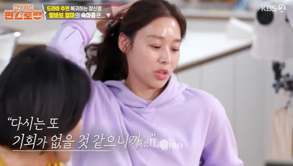 장신영은 “나란 사람을 믿고 ‘너 해봐’ 했는데 못하면 다시는 또 기회가 없을 것 같은 부다감이 있는 것”이라고 했다.