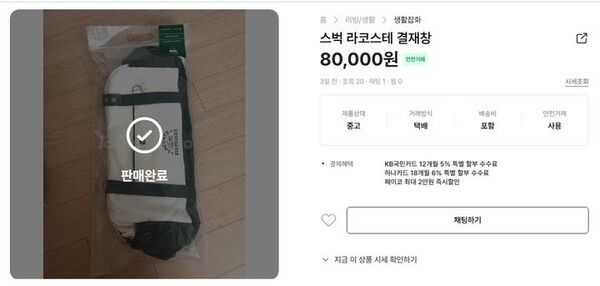 프리퀀시 리셀(중고 거래) 가격이 역대급으로 치솟은 것은 굿즈가 큰 인기를 모으고 있기 때문이다. 스타벅스는 라코스테(LACOSTE)와 협업해 선보인 테니스 콘셉트 굿즈(Goods·소장용 상품)로 '와이드 폴딩 체어', '와이드 폴딩 체어 사이드 포켓', '멀티플백'과 '트렌타월'를 내놨다.