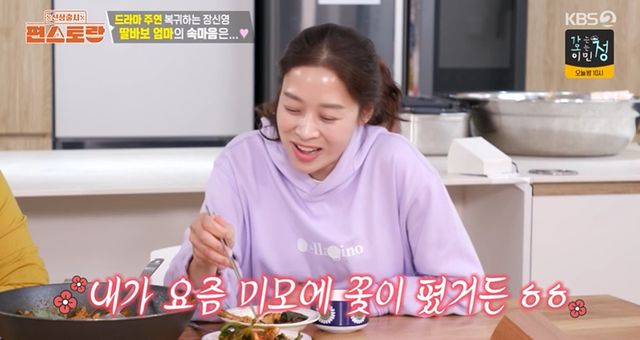 이보다 앞서 홈쇼핑으로 복귀한 장신영, 장신영의 어머니는 홈쇼핑에 나섰던 딸을 언급하며 "(지인들이) '너네 딸 완전 개나리다. 완전 예쁘다'라고 하더라"라고 전했다. 장신영은 이에 "내가 요즘 미모에 꽃이 피었거든"이라고 말해 웃음을 자아냈다.
