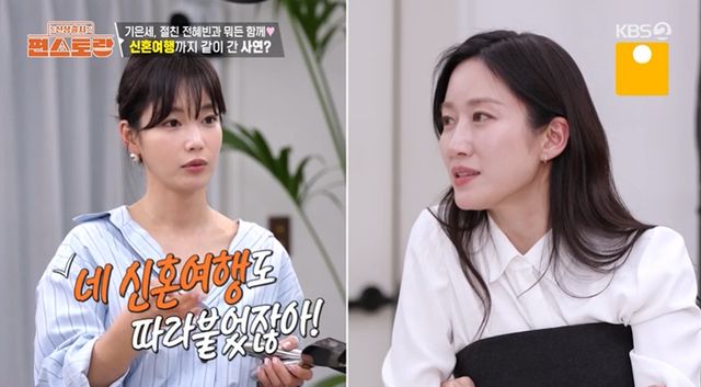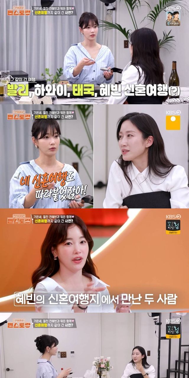 이날 방송에서 기은세는 전혜빈에게 "내가 얼마 전에 사진을 보는데 자꾸 네 사진이 뜨더라"라고 말했다. 이들의 하와이 사진이 공개됐고, 이에 기은세는 "발리, 하와이, 태국, 네 신혼여행 갔을 때도 따라붙어서"라고 말해 시선을 모았다.