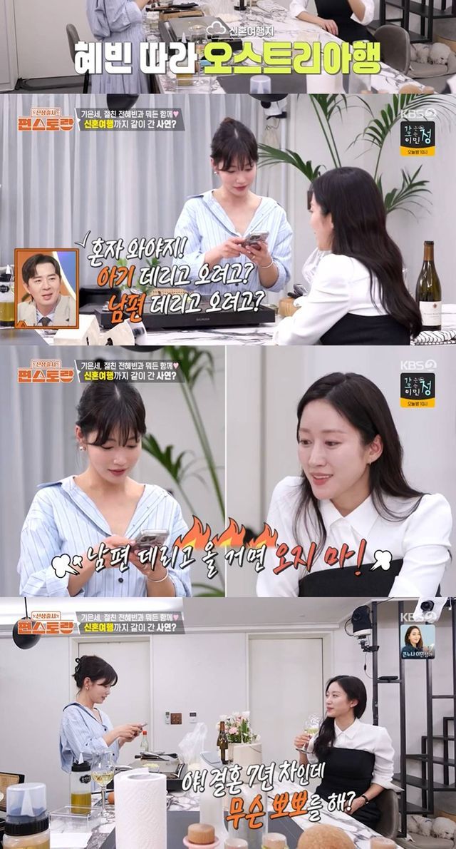 기은세는 전혜빈에게 "다음에는 파리 한번 가자"라며 여행을 제안했고, 전혜빈은 "혼자가 도 되냐"고 물었다. 그러자 기은세는 "남편 데리고 오려 그랬냐. 남편 데리고 올 거면 오지 마라. 배 아프니까"라고 돌직구를 날렸다.