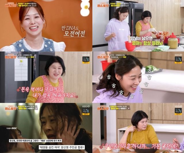 이날 장신영은 친정엄마와 나란히 앉아 열무를 다듬었다. 장신영은 “김장을 1년에 5번은 하는 것 같다”라며 친정엄마의 김치 자부심을 이야기했다. 실제로 장신영 친정엄마표 김치는 주변 사람들 모두가 인정하는 맛이라고.