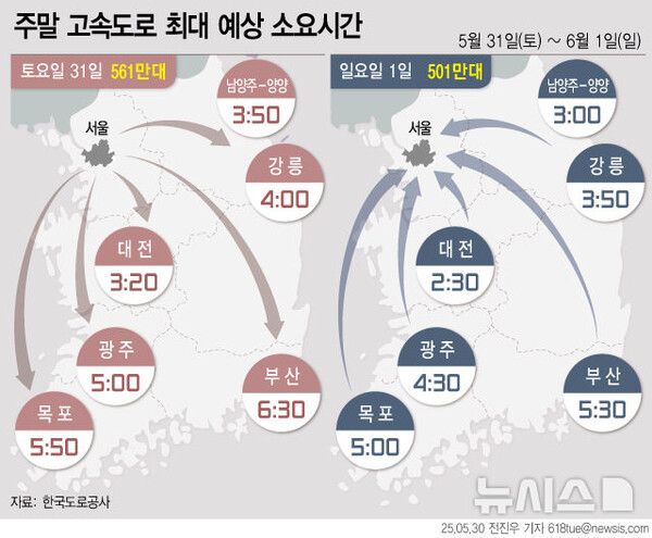 31일 토요일은 맑은 날씨와 제 21대 대선 사전투표 영향으로 전국 교통량이 평소보다 늘어날 것으로 전망된다.
