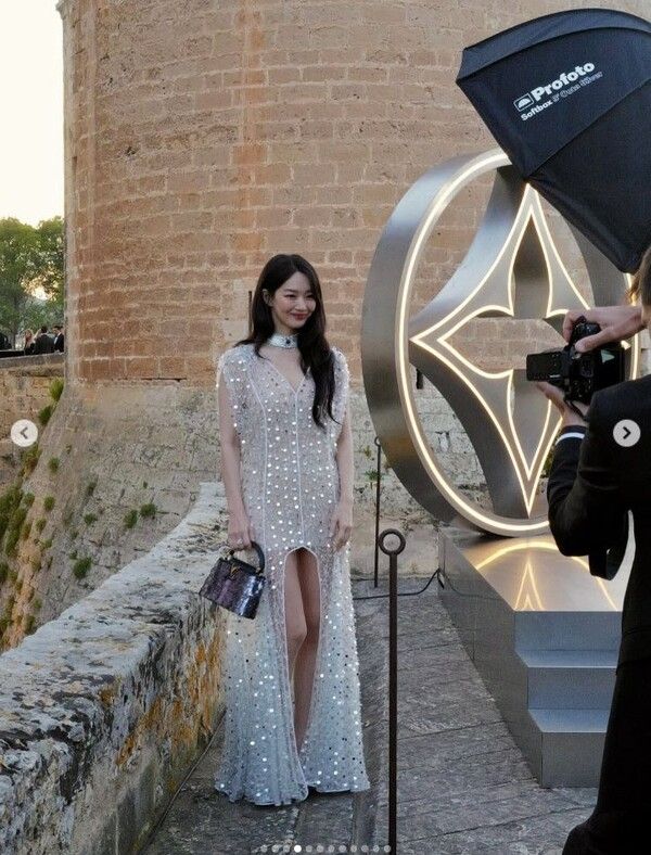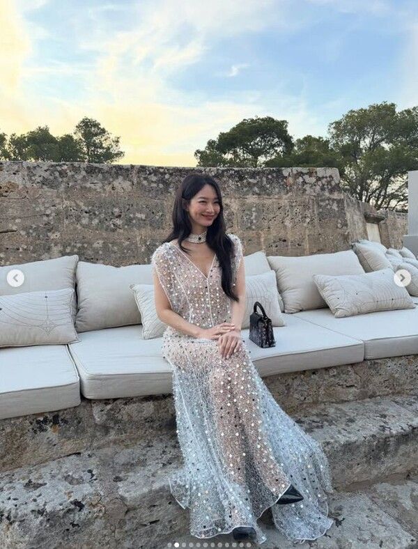 신민아는 지난 27일 자신의 소셜 미디어 계정에 스페인 팔마데마요르카에서 진행된 한 명품 브랜드 행사장 사진 여러 장을 공개했다. 공개된 사진 속 신민아는 은은하게 반짝이는 시스루 소재의 롱 드레스를 입고 우아한 분위기를 자아냈다. 특히 드러나는 듯 감춰진 듯한 실루엣은 신민아 특유의 매력을 한층 돋보이게 했다.