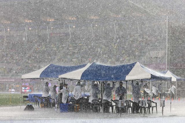 지난 29일 '2025 구미아시아육상경기선수권대회'가 열리는 경북 구미시민운동장에 폭우가 내리고 있다. / 뉴스1