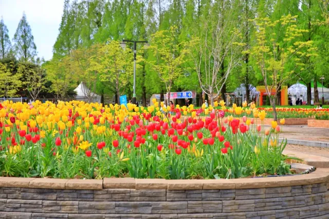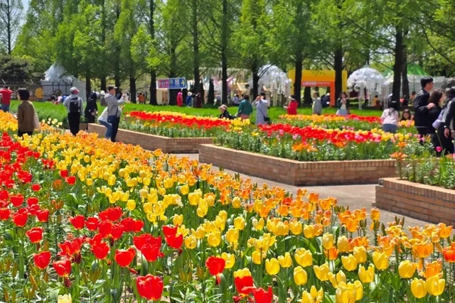 튤립정원은 가장 먼저 관람객의 눈길을 사로잡습니다. 다채로운 색상과 형태의 튤립이 유럽풍 조형물과 함께 정원을 채우며, 마치 유럽에 온 듯한 느낌을 줍니다. 붉은, 노란, 보랏빛 튤립이 어우러져 매력적입니다.