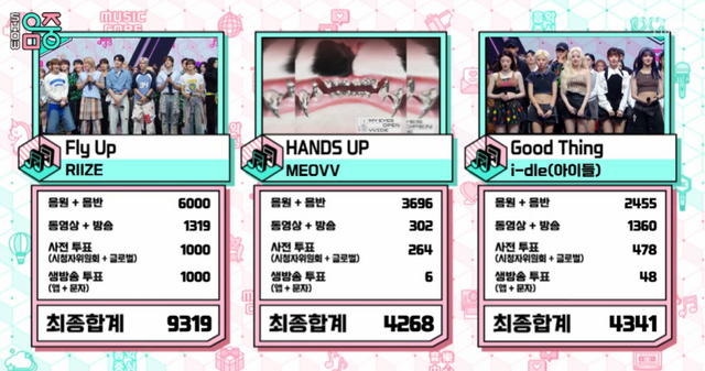 31일 방송된 MBC ‘쇼! 음악중심’에서는 라이즈 ‘플라이 업’, 미야오 ‘핸즈업’, 아이들 ‘굿 띵’이 1위를 놓고 경쟁했다.