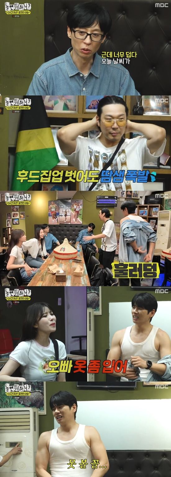 유재석은 식당에 들어서 "오늘 날씨가 너무 덥다 에어컨 켜자"라고 말했다. 이이경도 "너무 덥다. 어쩔 수 없다"며 상의를 탈의해 민소매 하나만 남겨뒀다. 이를 본 미주가 "저게 뭐냐"며 질색했다. 유재석도 "왜 옷을 벗어젖히고 난리냐"고 말했고, 하하도 이이경에게 "제정신이 아니다"라고 전했다.