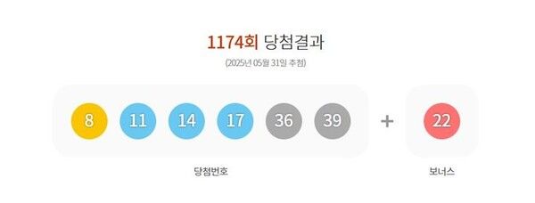 31일 실시된 제1174회 동행복권 로또 추첨 결과 '8, 11, 14, 17, 36, 39'가 1등 당첨 번호로 결정됐다. 2등 보너스 번호는 '22'이다.