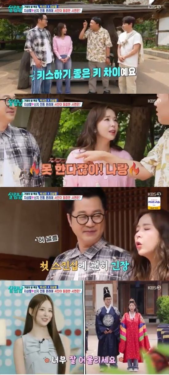 지상렬과 신지는 혼례복을 입어봤다. 김용명은 박서진을 업고는 지상렬과 신지에게도 시켰다.