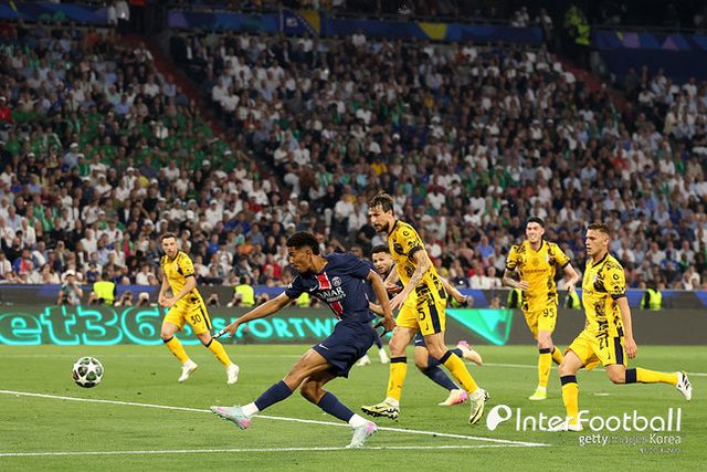 경기 초반부터 PSG가 강하게 몰아쳤다. 인터밀란은 내려앉고 PSG의 맹공을 막아냈다. 전반 9분 두에가 거리가 있는 위치에서 중거리 슈팅을 때렸는데 골키퍼 정면이었다.