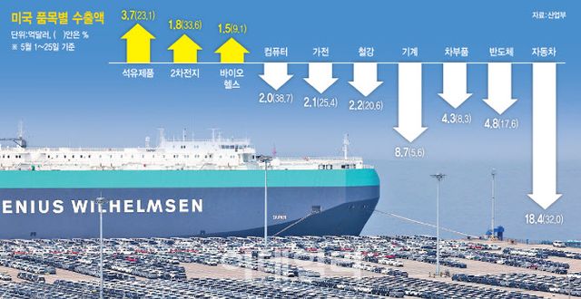 철강·자동차를 중심으로 미국 관세 부과 영향이 본격화하는 모습이다. 이 기간 대미 수출액은 100억 5000만달러로 전년대비 8.1% 감소했다. 특히 25% 관세가 부과된 자동차(18억 4000만달러)와 철강(2억 2000만달러) 수출액은 각각 32.0%, 20.6% 감소했다.