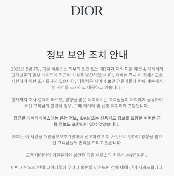 뉴시스 보도에 따르면, 개인정보위에 따르면, 디올은 지난 1월 발생한 유출사고를 5월 7일 인지했다고 5월 10일 신고했다. 티파니는 4월 발생한 유출사고를 5월 9일 인지했다고 5월 22일 신고했다.