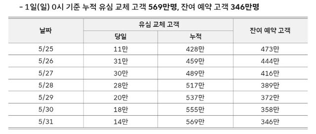전 주 하루 30만 건을 유지하던 당일 유심 교체 건수가 최근 3일간 20만건 미만으로 줄어든 건 현장 대기 발생 방지를 위해 문자 발송량을 조정한 영향으로 풀이된다. 지난 29일 당일 유심 교체 고객수는 20만 건, 30일엔 18만 건, 31일엔 14만 건을 기록했다.