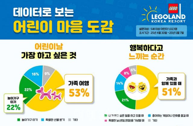 레고랜드 코리아 리조트는 다가오는 세계 놀이의 날(6월 11일)을 맞아 이 같은 내용이 담긴 어린이 대상 설문조사 결과를 공개했다. 지난 4월 30일부터 5월 7일까지 8일간 춘천 레고랜드 코리아를 방문한 어린이를 대상으로 대면 또는 온라인 방식으로 진행된 설문엔 전국 5세 이상 어린이 1023명이 참여했다.