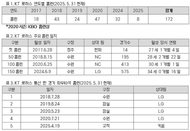 로하스는 데뷔 시즌을 제외하고 매년 20홈런 이상을 기록했다. 지난해 KBO 리그 역대 27번째 4시즌 연속 20홈런을 달성했다. 이번 시즌에는 KBO 리그에서 역대 13명만 기록하고 있는 5시즌 연속 20홈런에 도전하고 있다. 외국인 타자 중에는 우즈(전 두산)와 제이미 로맥(전 SSG)만 가지고 있는 기록이다