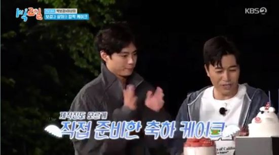 박보검과 이상이는 저녁 복불복을 앞두고 잠깐 사라졌다가 케이크를 들고 등장했다.