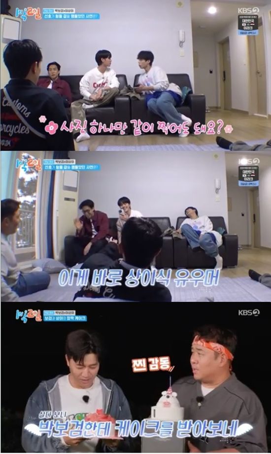 김종민과 문세윤은 예상치 못한 박보검의 케이크 선물에 깜짝 놀랐다.