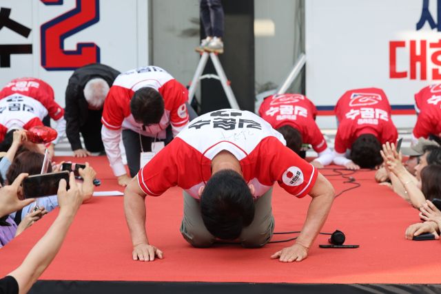 김 후보는 유세 현장에서 "계엄이 많은 어려움을 우리나라에 끼쳤다"며 "저희는 깊이 반성한다"고 하고는 큰절을 올리는 퍼포먼스도 이어가고 있다.