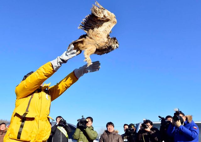 2014년 1월 13일 한국야생조류보호협회, 한국동물구조관리협회, 육군26사단 관계자들이 13일 오후 경기 양주시 남면 효천저수지 제방에서 멸종위기종인 수리부엉이를 방사하고 있다 / 뉴스1