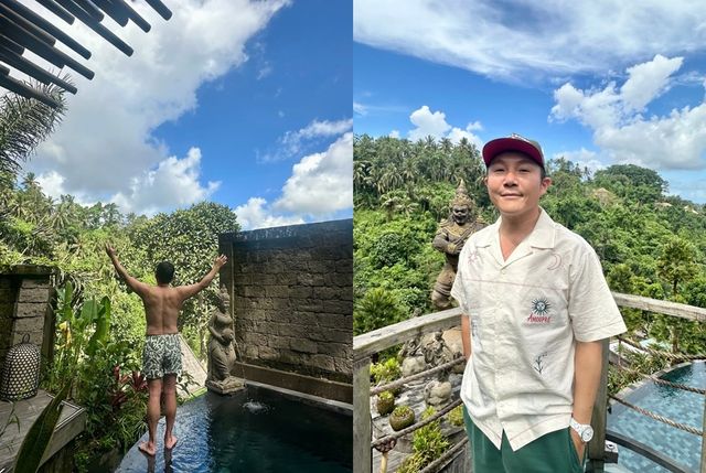 특히 조세호는 파란 하늘과 숲, 조각상들이 어우러진 발리의 풍경이 펼쳐진 수영장에서 상의를 탈의한 채 양팔을 올려 포즈를 취하고 있다.