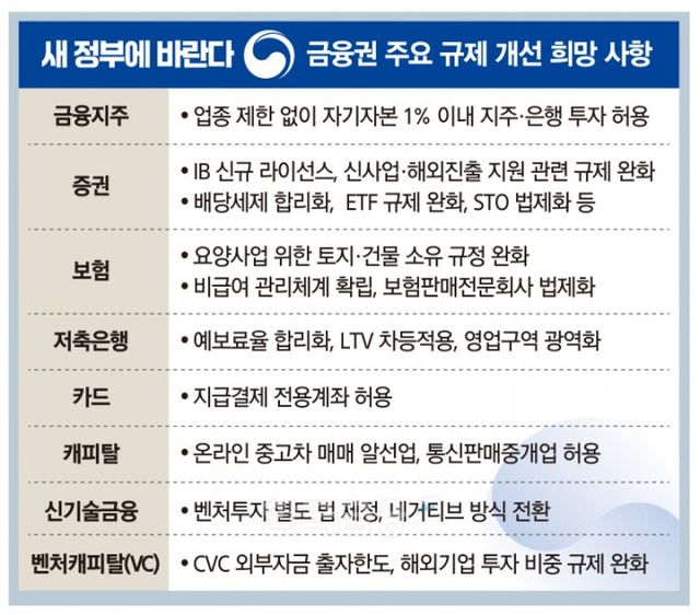 금융투자업계에서는 새로운 정부가 시장의 의견이 충분히 반영된 유연한 규제와 감독으로 자본시장 활성화를 지원해 주길 바랐다.