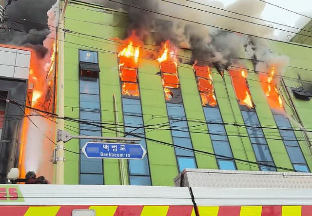 소방대는 “건물에서 검은 연기가 많이 나온다”는 119 신고를 접수해 진압에 나섰다. 소방당국은 오전 5시36분께 대응 1단계를 발령해 현장 인근 소방서의 인력과 장비를 동원했다. 펌프차 등 장비 53대와 인력 100명을 투입했다. 소방대는 농연으로 화점 접근이 곤란해 건물 밖에서 화점 구역에 방수를 실시하며 연소 확대를 저지했다.