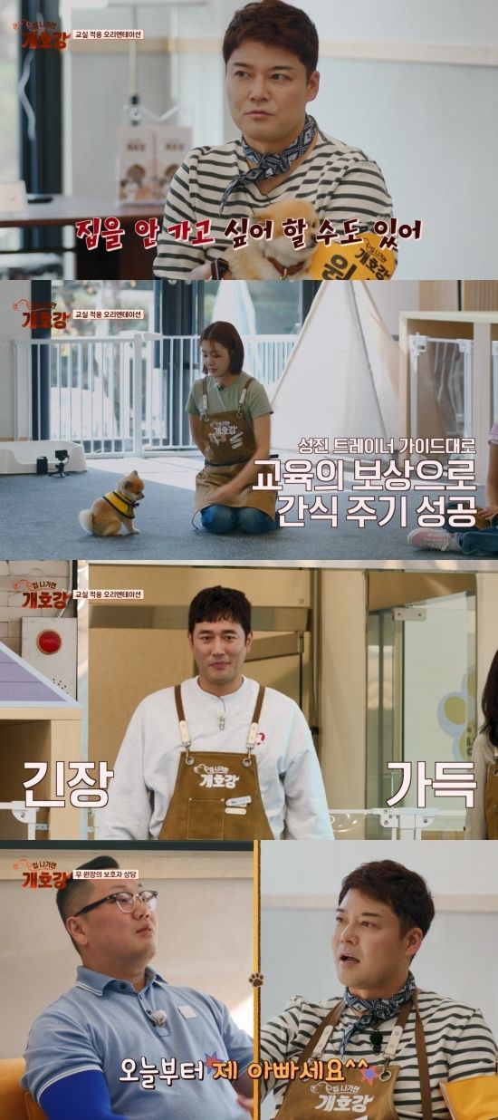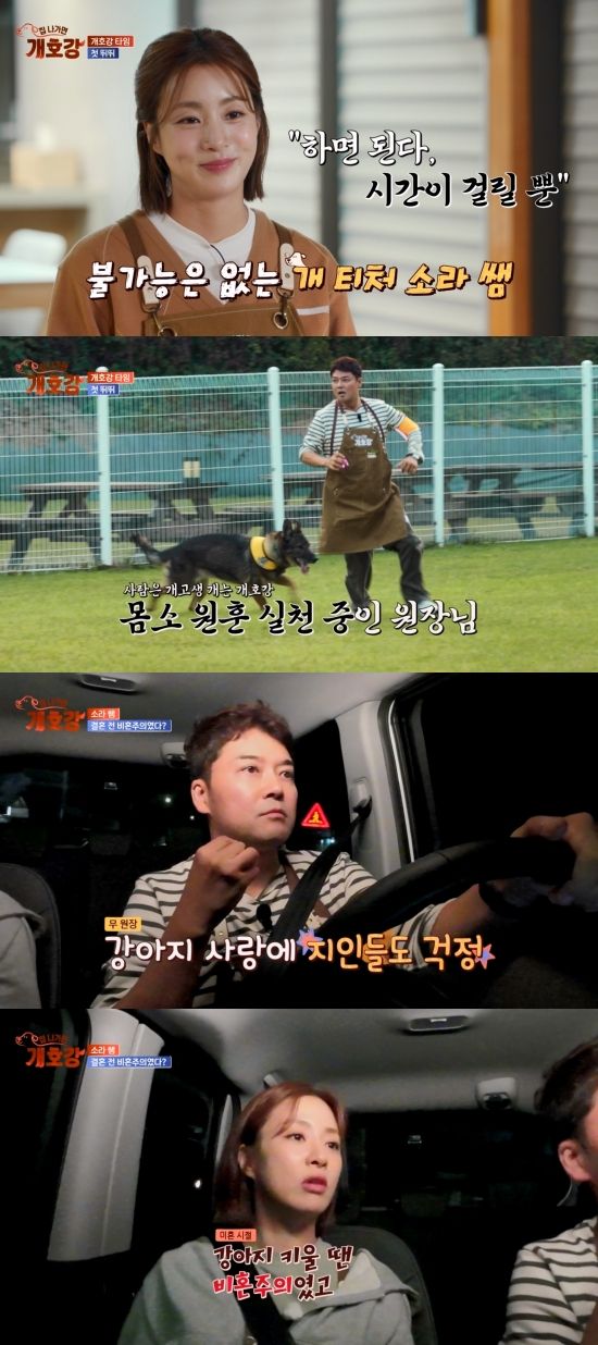 1일 방송된 JTBC 새 예능 ‘집 나가면 개호강’(이하 '개호강')에서는 강소라와 아이브 레이가 함께하는 중소형견 반, 조한선과 박선영이 함께하는 대형견 반 원생들이 입장했다.