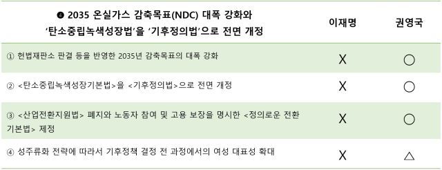 2035년 감축 목표치를 밝힌 후보도 권영국 후보 단 한 명이다. 권 후보는 70%를 목표치로 제시했고 정부의 기존 계획인 '제1차 탄소중립녹색성장기본계획'을 재검토해야 한다고 밝혔다.