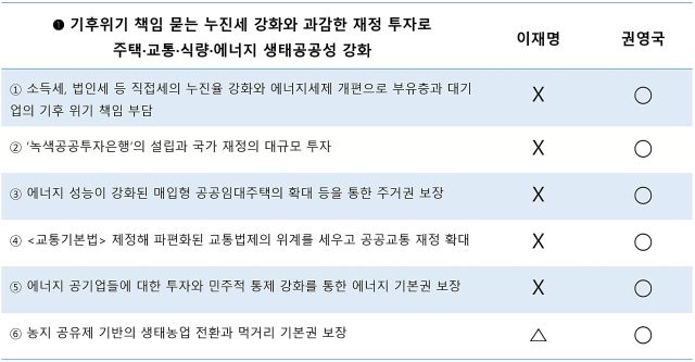 기후 변화에 따른 노동자의 타격과 관련해 권 후보는 "정의로운 탈석탄법을 제정해 발전노동자의 총고용을 보장하고, 내연기관 산업 노동자들의 정의로운 전환 대책도 마련할 것"이라며 "단체 교섭 범위 확대를 위한 법제도 개선"을 공약했다. 이재명 후보는 "정의로운 전환 특구 지정 및 고용 전환과 신산업 역량 개발 지원"을 약속했다.