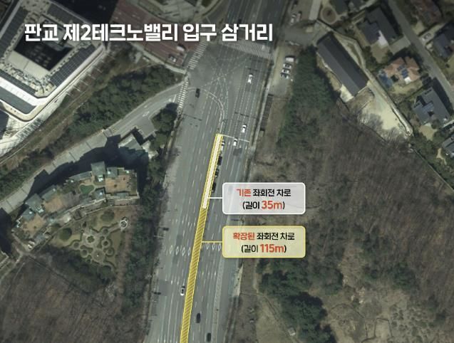 [와이뉴스] 성남시는 판교 제2·3 테크노밸리 일대의 교통혼잡 해소를 위한 단기 교통개선 대책의 일환으로 시흥사거리의 분당~내곡 방향 진출로에 대한 신호 운영을 개선하고, 제2테크노밸리 입구 삼거리의 좌회전 대기 차로를 기존 35m에서 115m로 대폭 연장했다고 2일 밝혔다.