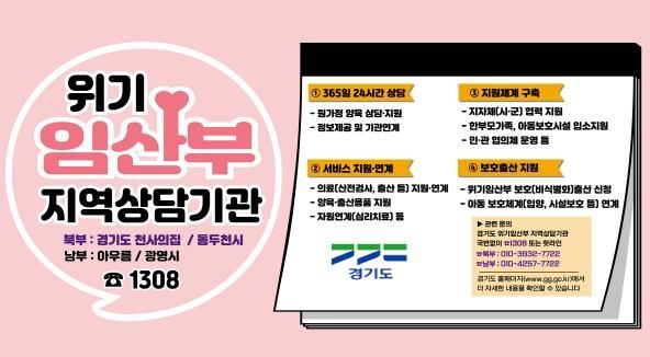 [와이뉴스] 경기도가 광명시에만 있는 ‘위기임산부 지역상담기관(전화 1308)’을 경기북부 동두천 지역에 추가로 설치해 운영에 들어갔다. 시·도별 1개소씩 운영되는 위기임산부 지역상담기관을 전국 최초로 추가한 것으로, 뜻하지 않은 임신과 출산으로 어려움을 겪는 임산부 지원이 한층 강화된 셈이다.