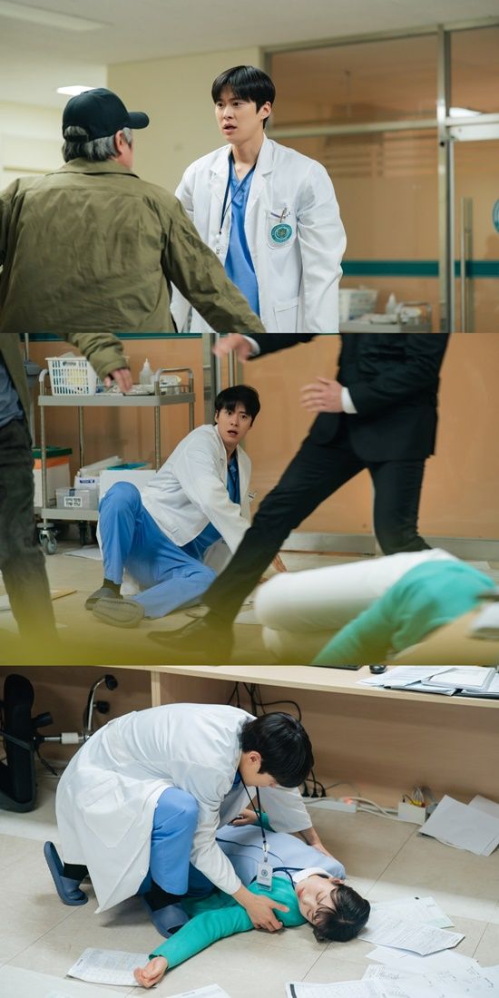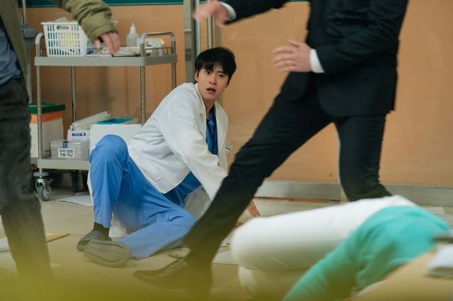 쓰러진 간호사 곁에 앉아 상태를 살피는 서의준의 모습도 눈길을 끈다. 흐트러진 문서와 어지럽혀진 공간은 당시 현장의 혼란을 고스란히 전하며 그날 병원에서 무슨 일이 있었는지에 대한 궁금증을 더한다.