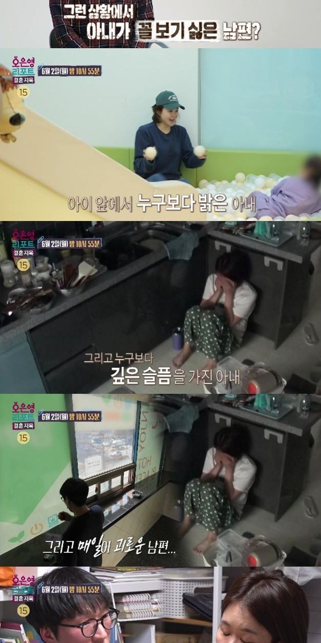 그런데 아이를 보낸 후 아내의 표정은 급격히 어두워진다. 아까와는 달리 확연히 가라앉은 분위기에 영상을 지켜보던 오은영 박사는 의아함을 감추지 못한다. 아내는 온갖 물건들이 잔뜩 쌓인 너저분한 거실로 시선을 옮기더니 한숨을 푹 내쉰다. 애써 정리를 해보려고 하지만 아내는 몸이 따라주지 않는 듯 “아, 못 하겠어...”라며 혼잣말한다.