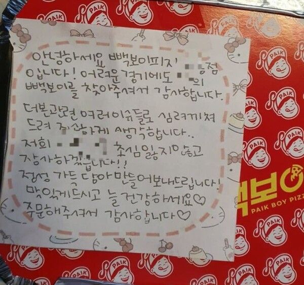 뉴시스 보도에 따르면, 지난달 31일 한 온라인 커뮤니티에는 동네에서 빽보이피자를 배달 주문했다고 밝힌 A씨가 '빽보이피자 눈물 나는 쪽지다'라는 제목의 게시물을 올리면서 매장 점주가 함께 보내온 손 편지를 공개했다.