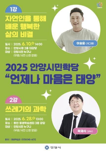 최대호 안양시장은 “다양한 주제의 강연으로 배움의 즐거움, 성장의 기쁨을 느낄 수 있는 안양시민학당에 시민들께서 많은 관심을 갖고 참여주시기 바란다”고 말했다.
