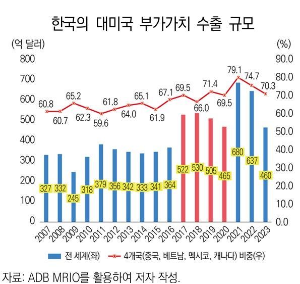 2일 산업연구원의 '한국의 대미국 수출구조 분석:부가가치 수출 기준' 보고서에 따르면 한국의 대미 부가가치(제조업+서비스업) 수출은 지난 2023년 기준 460억 달러로 추정된다.