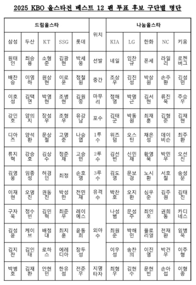 KBO는 오전 10시 투표 시작과 함께 ‘베스트 12’ 후보 120명도 공개했다. 후보 명단은 구단에서 추천한 각 포지션별 선수로 구성됐다. 투수는 선발, 중간, 마무리 총 3명을 더해 구단당 12명씩, 총 120명의 선수가 후보에 올랐다.
