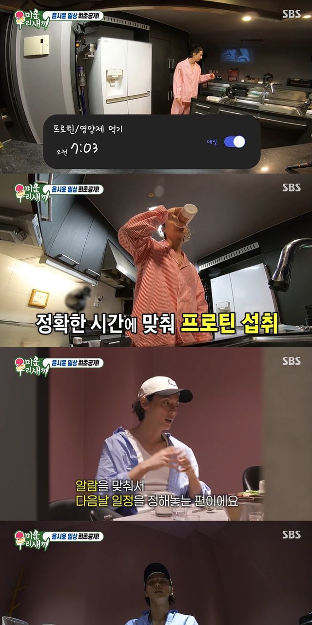 이날 윤시윤은 아침에 기상하자마자 프로틴 셰이크를 제조하며 하루를 시작했다. 특이하게도 이미 일어났음에도 불구하고 휴대폰 알람이 계속해서 울렸고, 프로틴과 영양제를 섭취하는 시간부터 발성 연습까지 모든 일정에 알람이 맞춰져 있었다.