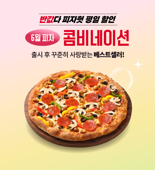 6월 ‘반값다 피자헛’ 프로모션은 클래식한 매력으로 오래 사랑받고 있는 피자헛의 스테디셀러 ‘콤비네이션 피자’를 평일 반값 혜택 대상으로 채택했다. ‘콤비네이션 피자’는 다양한 고기 토핑과 신선한 야채가 조화롭게 어우러져, 다양한 소비자 취향을 만족시킬 수 있을 것으로 기대한다.